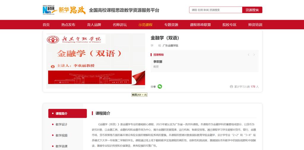 “新华思政”平台由新华网承建,是教育部指定的国家级课程思政资源展示与共享平台,旨在推动优质思政教育资源共建共融。此次入选的课程案例,充分体现了《金融学(双语)》课程在思政教育中的创新和引领作用:一是在理论教学中引用我国金融学科研究成果,引导学生立足本土分析全球金融问题;二是通过讲解介绍我国金融机构与政策案例,传递服务实体经济、防范金融风险的价值导向;三是依托国际生源和金融学科专业背景,在跨文化对话中增强学生的家国情怀与文化自信。