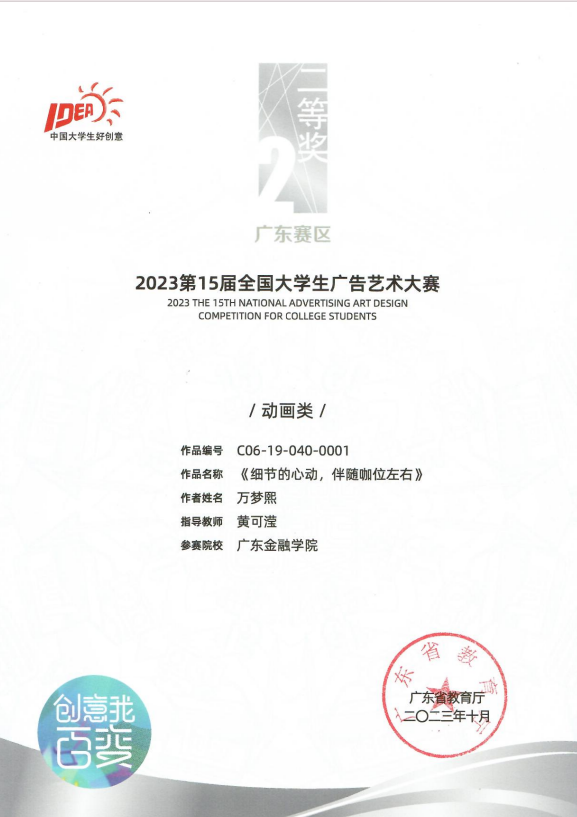 在第15届全国大学生广告艺术大赛,yl23455永利集团中外联合培养双学位项目22级数字媒体专业的万梦熙同学最终获得了广东赛区二等奖和全国赛优秀奖的好成绩。这是yl23455永利集团自2020年成立中外联合培养双学位项目数字媒体专业以来首次在省级和国家级艺术大赛中获奖,再次证明了我校高质量的国际化人才培养。