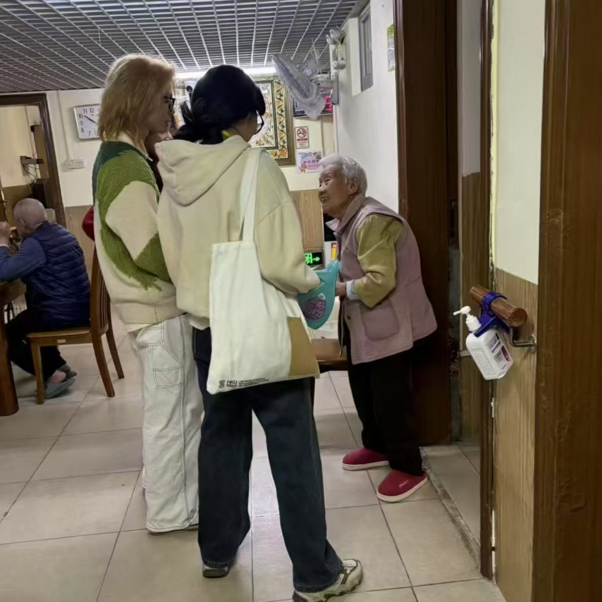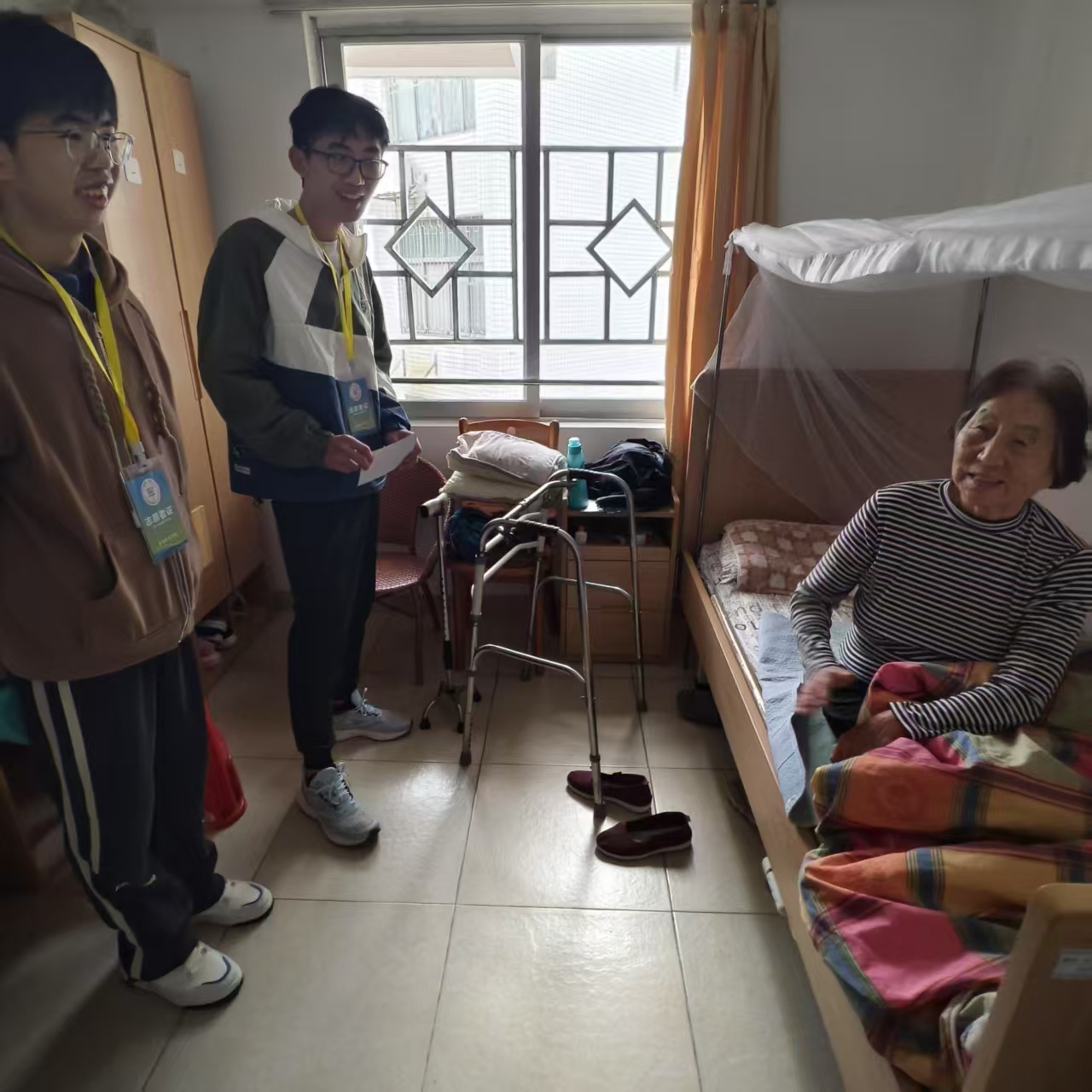 活动进入"温情入户"环节,志愿者们分成若干小组,分别前往不同楼层开展活动。每个小组配备3-4名志愿者,携带精心准备的伴手礼套装,逐户拜访老人。