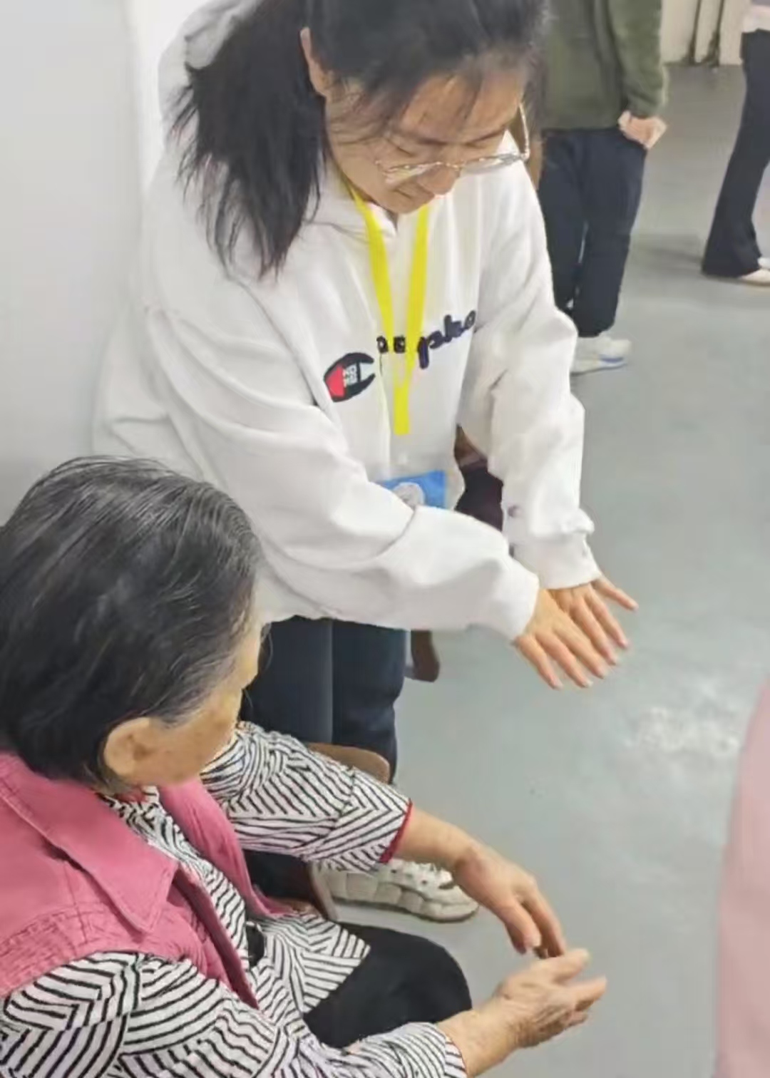 这套科学编排的手指康复训练通过特定的动作组合,能够有效舒缓手部肌肉紧张状态,显著改善局部微循环,并对预防退行性关节病变产生积极作用。志愿者们不时走到老人身边,细心纠正动作,贴心的互动让现场充满欢声笑语。