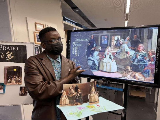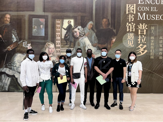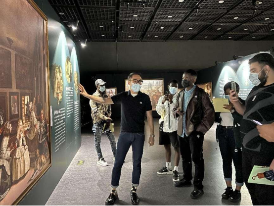 在馆方的组织下,我校来华留学生近距离观看了来自西班牙普拉多博物馆收藏的,西班牙画家委拉斯凯兹的经典名作《宫娥》、意大利著名画家提香的《查理五世的米尔贝格之战》、女性画家克拉拉的静物画《蛋糕和橄榄的静物画》、德国著名画家丢勒的《自画像》等29副绘画作品的复制品。学生们在导赏中不但领略了大师的绘画风采,更透过艺术作品走进了当时欧洲人们的生活。