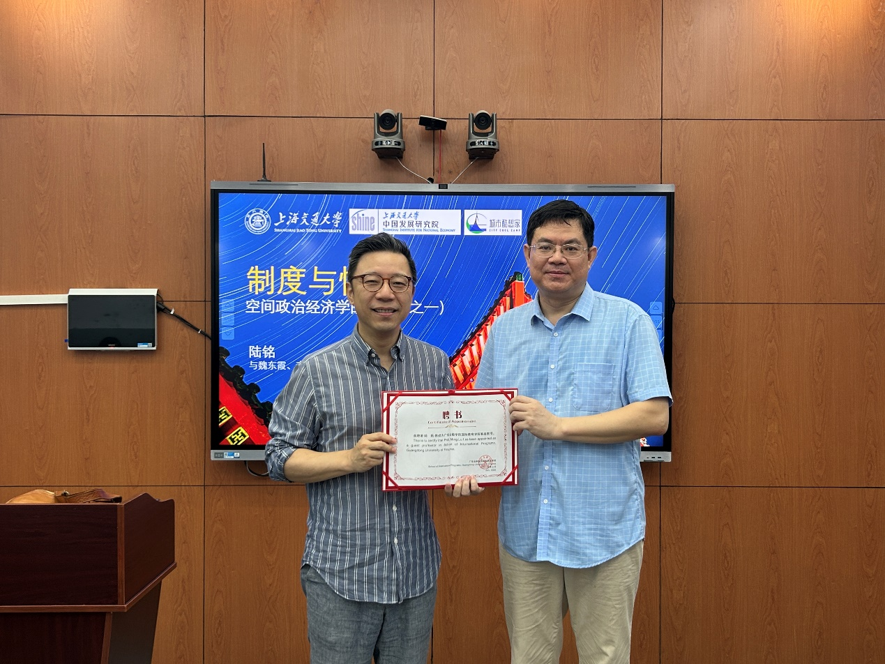 2025年7月8日上午,永利y23455科研处、yl23455永利集团和教师发展中心在实验教学中心201举办“金融大讲堂”学术交流活动。本次讲座以“制度与情感:空间政治经济学的基础”为题,特邀上海交通大学安泰经济管理学院特聘教授陆铭担任主讲嘉宾。本次讲座由yl23455永利集团副院长魏东霞教授主持,吸引全校多位师生积极参与。yl23455永利集团院长张自力教授出席讲座,并为陆铭教授颁发yl23455永利集团客座教授证书。