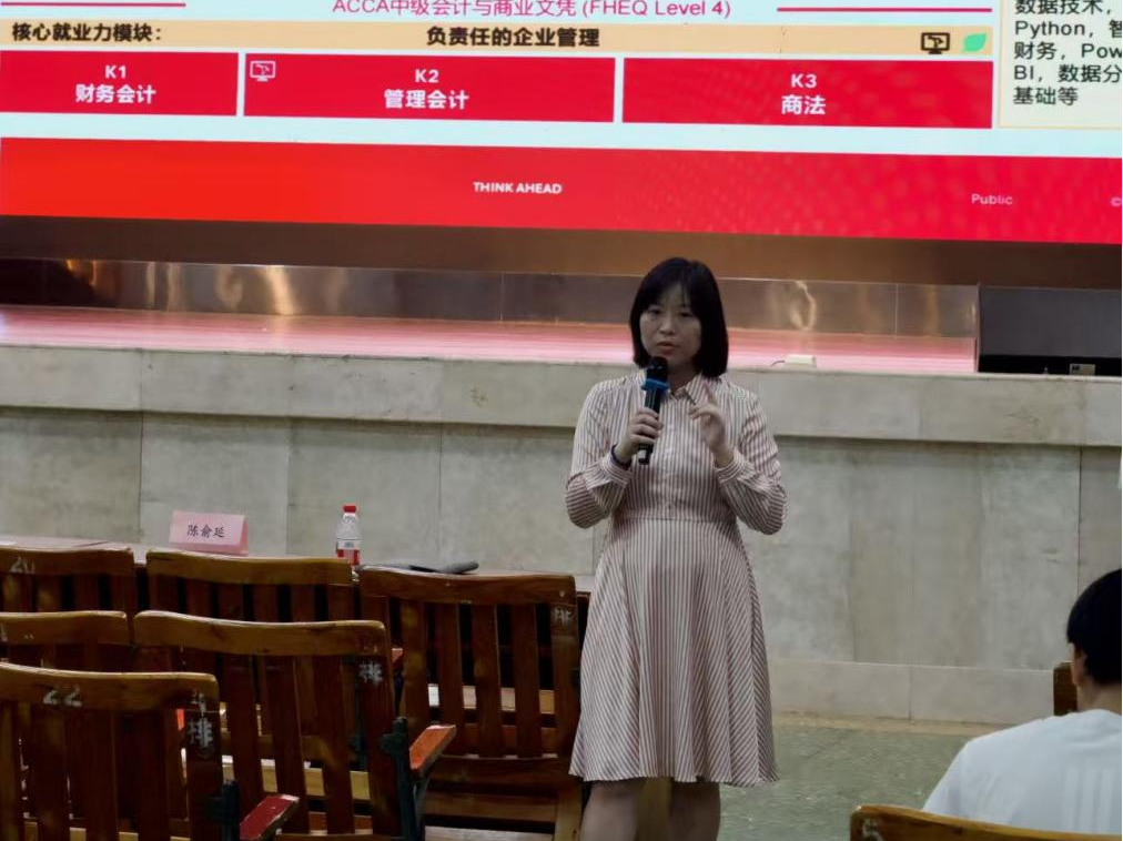 紧接着,ACCA广州教育关系经理李艳婷老师深度解读了ACCA证书背后呈现的各维度能力,从广受认可的专业程度,到能够对抗不确定性的完整能力体系,最后与未来专业资格商业+AI的可持续发展相关联。