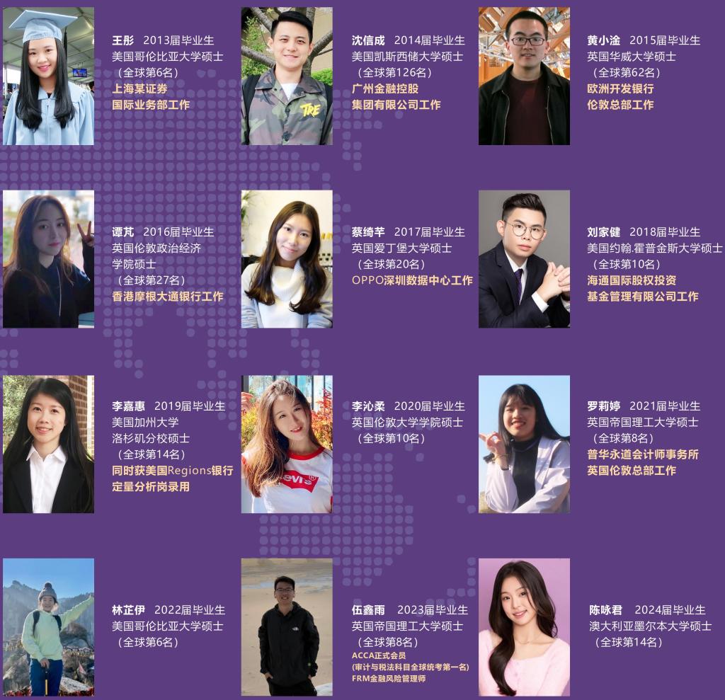 yl23455永利集团近6届中外联合培养双学位申研毕业生中,64.8%的毕业生能进入帝国理工学院、新加坡国立大学、伦敦大学学院、南洋理工大学、哥伦比亚大学、约翰霍普金斯大学、墨尔本大学、香港大学等世界50强名校读研深造;25.7%的毕业生能进入布里斯托大学、香港科技大学、伊利诺伊大学厄巴纳香槟分校、香港理工大学等世界51-100强名校读研深造;就业遍布欧洲开发银行、美国银行、四大会计师事务所等世界行业领军机构。