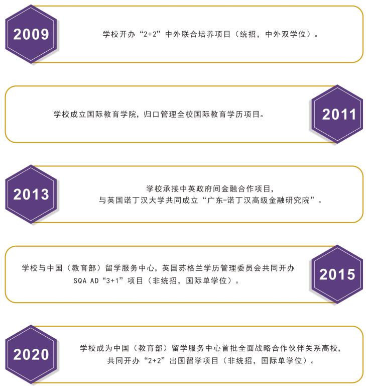 2015年,学校进一步拓展国际合作路径,与教育部(中国)留学服务中心及苏格兰学历管理委员会合作,引进“SQA AD 3+1”国际本科项目(非统招),将国际化教育覆盖面从统招学生延伸至更广泛的非统招生源。