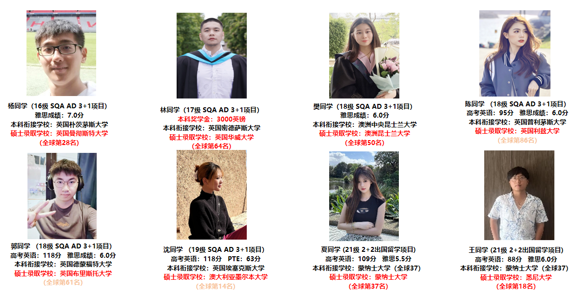 此外,学院已成功培养八届国际本科项目单学位项目(非统招)毕业生,总计约七百余人。历届国际本科项目毕业生中,绝大多数选择继续深造,其中超过70%学生凭借卓越实力,成功跻身世界百强名校攻读硕士学位。尤为瞩目的是,已有近百名精英学子获得墨尔本大学(全球第19位)、新南威尔士大学(全球第20位)、悉尼大学(全球第25位)、爱丁堡大学(全球第34位)、蒙纳士大学(全球第36位)、昆士兰大学(全球第42位)、布里斯托大学(全球第51位)等世界顶尖名校的硕士录取。