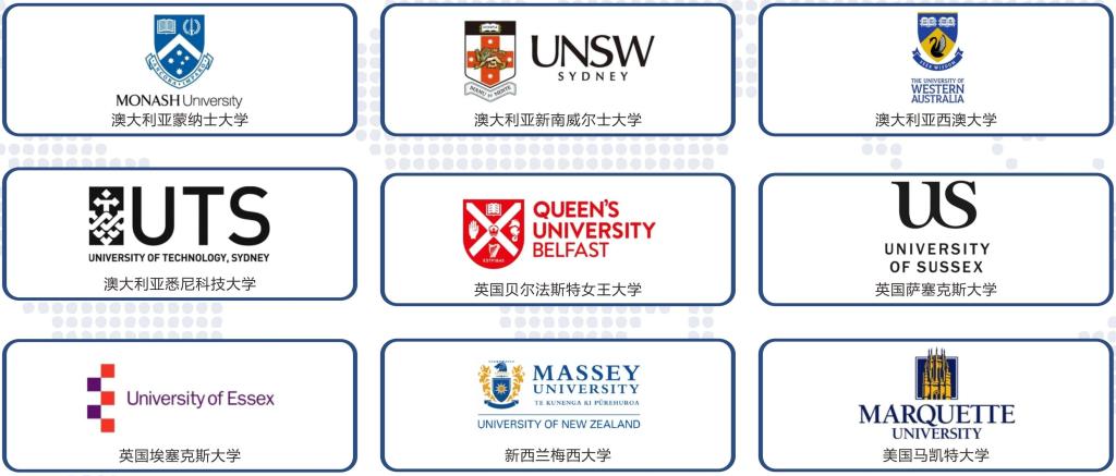 〇 澳大利亚蒙纳士大学 〇 新西兰梅西大学 〇 英国贝尔法斯特女王大学 〇 英国西英格兰大学 〇 美国马凯特大学 〇 美国西阿拉巴马大学 |