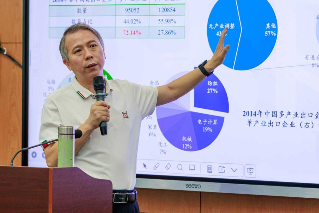 黄新飞教授在讲座中指出,在全球贸易格局重塑与去中国化暗流下,企业出口多元化绝非盲目跨界,而是围绕核心优势的关联产业延链。数据表明,虽多产品企业数量占比不足一半,却贡献了超七成贸易额,活力正源于对产品组合的动态调整。随后,黄新飞教授详细介绍了研究模型及其系列结果,并对模型构建和研究结果进行了阐释。