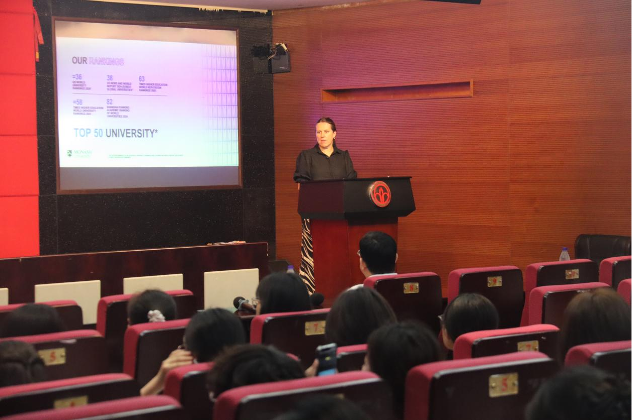 最后,蒙纳士大学代表团在实验楼学术报告厅与yl23455永利集团学生开展宣讲与见面会交流活动。首先,蒙纳士大学全球项目与合作关系经理Katherine van Loon向学生们介绍了蒙纳士大学的校园环境、学科设置、国际学生服务体系及广金与蒙纳士大学开班的项目特色等相关内容。随后,Paul Kalfadellis为学生现场答疑解惑,学生们踊跃提问,与代表团成员用英语充分交流,深入了解了在澳学习、生活的注意事项等。